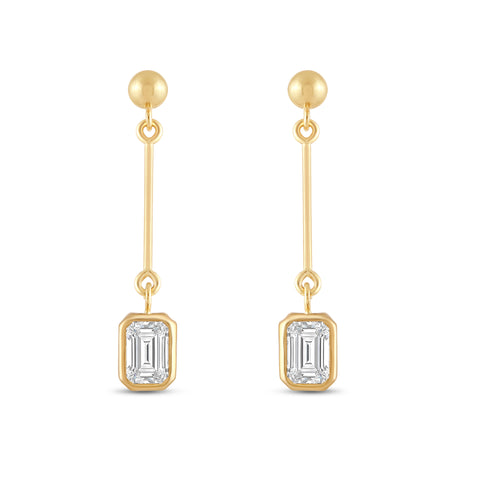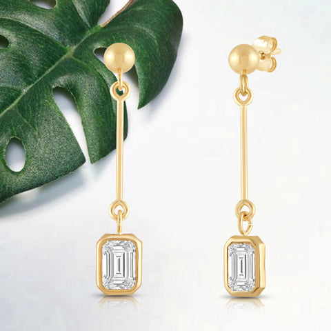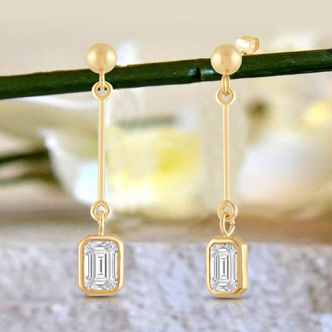 Presenting an exquisite earring crafted from 14K solid yellow gold, featuring a 3mm rhodium-plated ball and a dazzling 7mm emerald cut cubic zirconia (CZ) stone, equivalent to 1.0 carats. Our top-grade AAAAA CZ stones possess the brilliance of real diamonds, typically worth thousands of dollars. Expertly mounted in a sturdy bezel setting, these stunning earrings gracefully dangle from your ears, secured with a 14k Gold Push Butterfly Friction Post. Crafted solely from solid 14K yellow gold, with no mixed metals, plating, or filling, this earring radiates pure elegance. To add a touch of luxury, your earrings will arrive elegantly presented in a deluxe black velvet box. Whether you're looking to surprise a loved one or treat yourself, these earrings are a perfect choice that radiates sophistication and timeless charm.