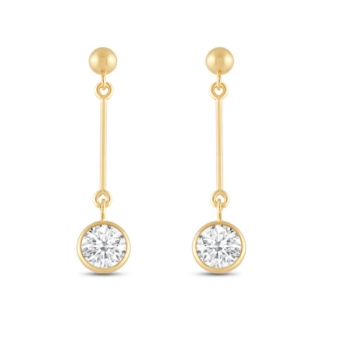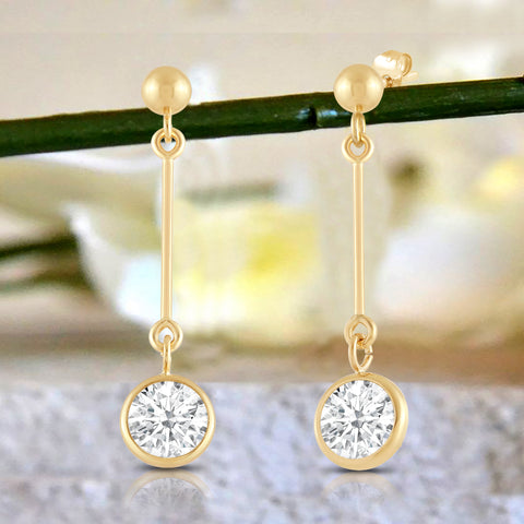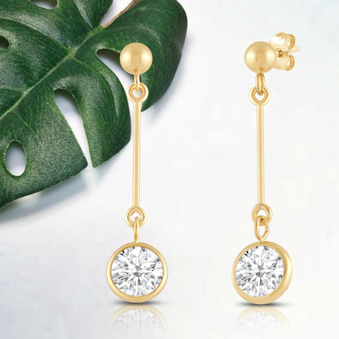 Presenting an exquisite earring crafted from 14K solid yellow gold, featuring a 3mm rhodium-plated ball and a dazzling 6mm round cut cubic zirconia (CZ) stone, equivalent to 1.0 carats. Our top-grade AAAAA CZ stones possess the brilliance of real diamonds, typically worth thousands of dollars. Expertly mounted in a sturdy bezel setting, these stunning earrings gracefully dangle from your ears, secured with a 14k Gold Push Butterfly Friction Post. Crafted solely from solid 14K yellow gold, with no mixed metals, plating, or filling, this earring radiates pure elegance. To add a touch of luxury, your earrings will arrive elegantly presented in a deluxe black velvet box. Whether you're looking to surprise a loved one or treat yourself, these earrings are a perfect choice that radiates sophistication and timeless charm.