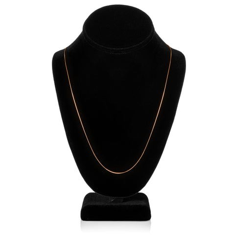 Timeless elegance in solid 14K Rose Gold. This fine gauge 22-inch box link chain ends in a spring ring clasp and measures at .60 mm thickness. The box link chain is known for its link strength and beautiful sheen encircling the neck. It appears delicate, but is amazingly sturdy enough for daily wear. The 22-inch length falls at or above a low neckline. A lifetime piece for your gold jewelry collection, made of solid 14K gold, not plated or filled. These fine chains are elegantly presented in a quality two-tone "Everyday Elegance" box with a magnetic closure, a perfect gift for yourself or a loved one.