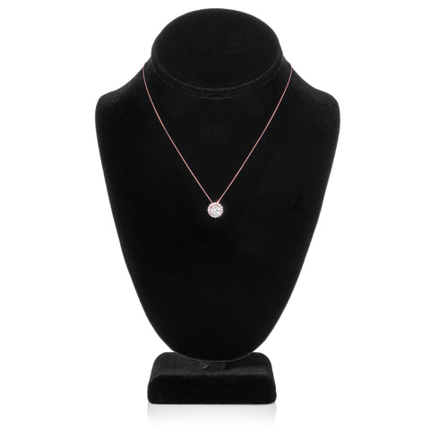 This divine pendant boasts a brilliant Round cut 6.5 mm (1.0 carat) Cubic Zirconia stone (CZ). Creating a halo around the main stone are 16 more 1.5 mm CZs for a total diamond equivalent of 1.24 carats . Our top-grade AAAAA CZ look just like a real diamond that would cost thousands of dollars. Professionally mounted in a heavy basket setting, this radiant pendant dangles from a 16-inch box link chain with a springring clasp. Crafted in solid 14K Rose Gold, with no other metals mixed (not plated or filled). Your necklace will arrive elegantly presented in a deluxe black velvet box. It is a perfect gift for a loved one or for yourself!