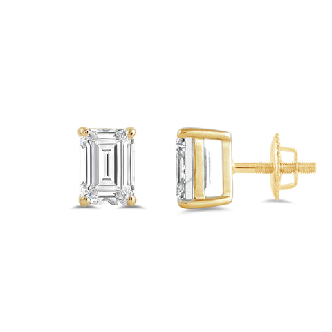 This classic pair of stud earrings showcases exquisite emerald cut Cubic Zirconia center stones measuring 7 mm for 2.0 CTW (1.0 CT each). Due to its brilliant and traditional design, emerald cut is one of the popular and sought-after stone shapes. Our CZ looks just like a real diamond that would cost thousands of dollars. Professionally mounted in a 4-prong setting, these luxe earrings are secured with screw-back fastenings, all crafted in solid 14K Yellow Gold. Your earrings will arrive elegantly presented in a deluxe black velvet box. They will make a perfect gift for a loved one or for yourself!