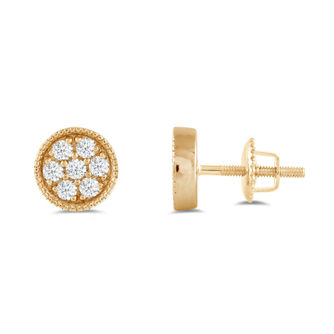 This classic pair of round shape pave stud earrings with miligrain details showcases exquisite round cut Cubic Zirconia stones measuring 1.6 mm each and total of 14 cz crystal stones. Due to its brilliant and traditional design, pave studs are one of the popular and sought-after earrings. Our CZ looks just like a real diamond that would cost thousands of dollars. Professionally mounted in a pave setting, these luxe earrings are secured with screw-back fastenings, all crafted in solid 14K Yellow Gold. Your earrings will arrive elegantly presented in a deluxe black velvet box. They will make a perfect gift for a loved one or for yourself!