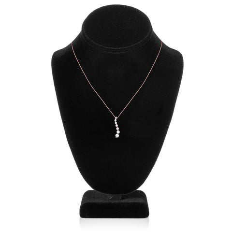 This exquisite pendant is all about the serpentine swoop of seven showstopping Round cut Cubic Zirconia stones in graduated sizes ranging from 1.7 mm to 3.5 mm diameter (.48 carat total weight, diamond equivalent). Our top-grade AAAAA CZ look just like a real diamond that would cost thousands of dollars. Professionally mounted in a heavy basket setting, this alluring pendant dangles from a 16-inch box link chain with a springring clasp. All are crafted in solid 14K Rose Gold, with no other metals mixed. Your necklace will arrive elegantly presented in a deluxe black velvet box. It is a perfect gift for a loved one or for yourself!