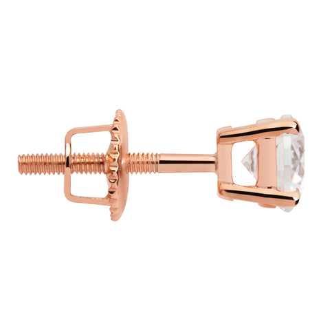 This classic pair of stud earrings showcases exquisite round-cut Cubic Zirconia center stones measuring 4.1 mm for 0.50 CTW (0.25 CT each). Due to its brilliant and traditional design, round cut is the most popular and sought-after stone shapes. Our CZ looks just like a real diamond that would cost thousands of dollars. Professionally mounted in a heavy basket setting, these chic earrings are secured with screw-back fastenings, all crafted in solid 14K Rose Gold. Your earrings will arrive elegantly presented in a deluxe black velvet box. They will make a perfect gift for a loved one or for yourself!