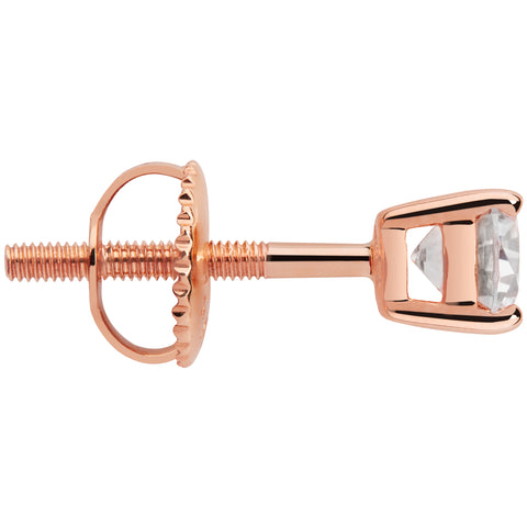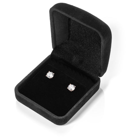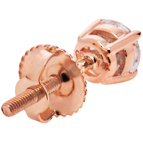 This classic pair of stud earrings showcases exquisite round-cut Cubic Zirconia center stones measuring 5.0 mm for 1.0 CTW (0.50 CT each). Due to its brilliant and traditional design, round cut is the most popular and sought-after stone shapes. Our CZ looks just like a real diamond that would cost thousands of dollars. Professionally mounted in a heavy basket setting, these chic earrings are secured with screw-back fastenings, all crafted in solid 14K Rose Gold. Your earrings will arrive elegantly presented in a deluxe black velvet box. They will make a perfect gift for a loved one or for yourself!