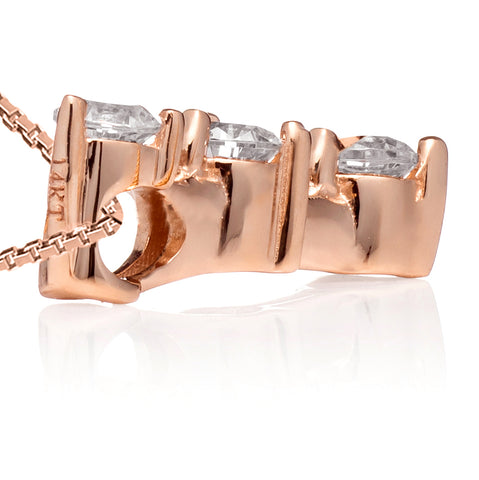 This exquisite pendant shows off three brilliant Round cut Cubic Zirconia stones, measuring in graduated sizes of 2.5 mm, 2.7 mm, and 2.9 mm (.22 carat total weight, diamond equivalent). Our top-grade AAAAA CZs look just like a real diamond that would cost thousands of dollars. Professionally mounted in a heavy basket setting, this lovely pendant dangles from an 18-inch box link chain with a springring clasp. All are crafted in solid 14K Rose Gold, with no other metals mixed (not plated or filled). Your necklace will arrive elegantly presented in a deluxe black velvet box. It is a perfect gift for a loved one or for yourself!