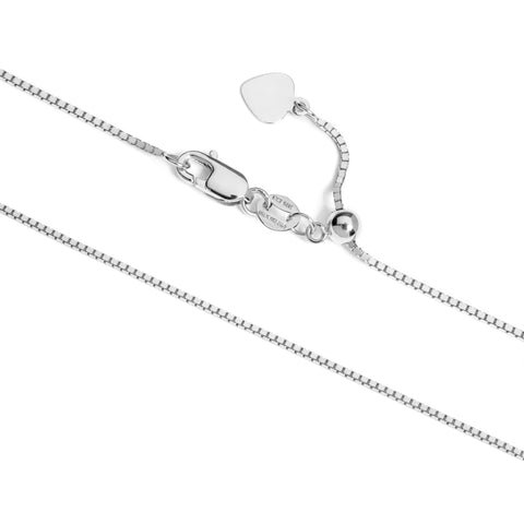 This fine gauge 14K White Gold box link chain is simply elegant. The solid gold chain measures at .85 mm thickness and ends in a lobster claw clasp . The box link chain is known for its link strength and beautiful sheen encircling the neck. It appears delicate, but is amazingly sturdy enough for daily wear. The 22-inch length falls at or above a low neckline, but with the handy adjustable slide you can change the length of this chain to go with any neckline. These fine chains are elegantly presented in a quality two-tone "Everyday Elegance" box with a magnetic closure, a perfect gift for yourself or a loved one.