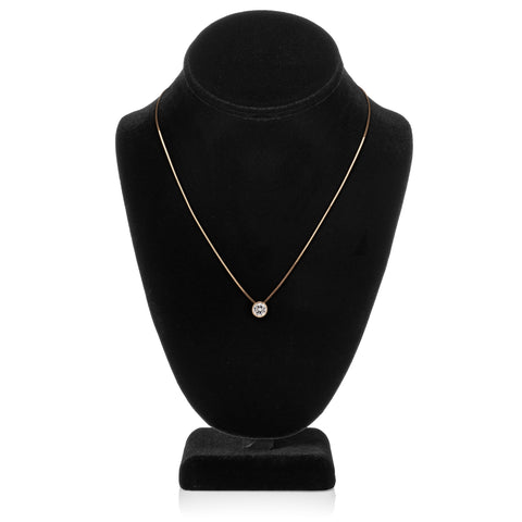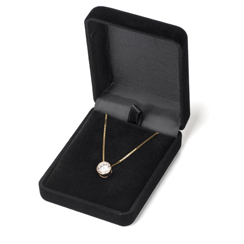 This ethereal pendant shows off a brilliant Round cut Cubic Zirconia stone that looks just like a real diamond without the hefty price tag. Professionally mounted in a thick bezel setting, this beautiful pendant dangles from an 18-inch box link chain with a springring clasp. The pendant and chain are crafted in solid 14K Yellow Gold with no other metals mixed. Your necklace will arrive elegantly presented in a deluxe black velvet box. It is a perfect gift for a loved one or for yourself!