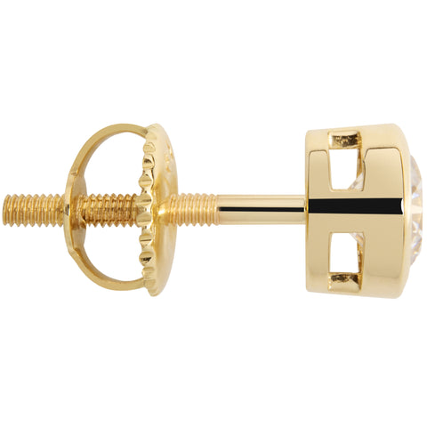 This classic pair of stud earrings showcases two dazzling Round cut Cubic Zirconia center stones measuring 5.0 mm each (.46 CTW) for .92 CTW. Due to its brilliant and traditional design, Round cut is the most popular and sought-after stone shapes. Our CZ looks just like a real diamond that would cost thousands of dollars. Professionally mounted in a beautiful bezel setting, these alluring earrings are secured with screw-back fastenings, all crafted in solid 14K Yellow Gold. Your earrings will arrive elegantly presented in a deluxe black velvet box. They will make a perfect gift for a loved one or for yourself!