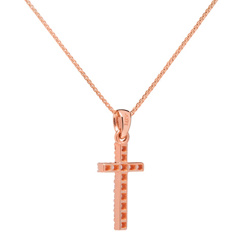 14K Solid Rose Gold Cross | Pave Round Cut Cubic Zirconia Pendant Necklace | 15mm Long .30 CTW | 16 Inch .60mm Box Link Chain | With Gift Box