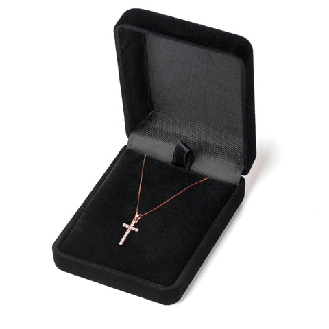 Gorgeous pendant featuring a brilliant pave cross with .30 carats of cubic zirconia (CZ) stones. This stunning pendant with 13 round cut CZs is professionally pave set and dangles from an 18-inch sturdy .60mm thick box link chain with a spring ring clasp. All are crafted from solid 14K Rose gold, with no other metals mixed (not plated or filled). This beautiful necklace is elegantly presented in a deluxe black velvet box. It is a perfect gift for a loved one, or for yourself!