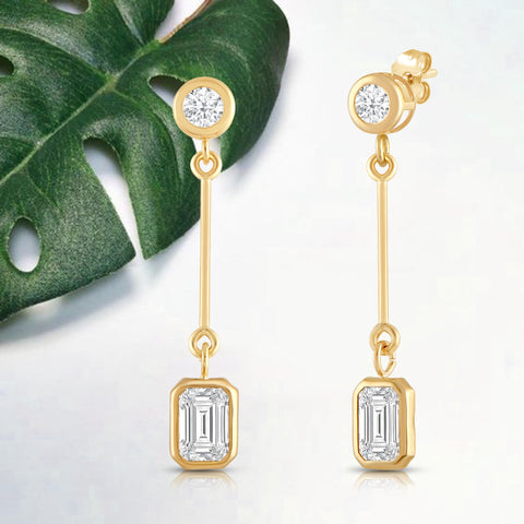 Introducing our exquisite 14K solid gold earrings, featuring an earring with a brilliant 4mm round cut stone at the top and a dazzling 7mm emerald cut cubic zirconia (CZ) stone at the bottom. The CZ stone is equivalent to 1.25 carats. Our top-grade AAAAA CZ stones possess the brilliance of real diamonds, typically worth thousands of dollars. Expertly mounted in a sturdy bezel setting, these stunning earrings gracefully dangle from your ears, secured with a 14k Gold Push Butterfly Friction Post. Crafted solely from solid 14K yellow gold, with no mixed metals, plating, or filling, this earring radiates pure elegance. Your cherished piece will arrive luxuriously presented in a deluxe black velvet box, making it an ideal gift for a loved one or a delightful treat for yourself.