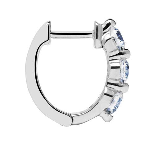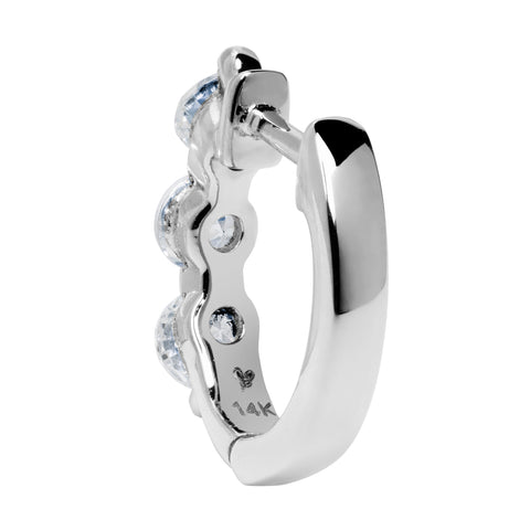 A brilliant and classy pair of "huggie" style hoop earrings boasting three individual 2.8 mm Round cut Cubic Zirconia stones per earring totaling .48 carats (.24 carat each earring diamond equivalent). Top Quality Grade AAAAA Cubic Zirconia look just like real diamonds. They are beautifully crafted in solid 14K White Gold with no other metals mixed. They feature a hinged hoop with a secure snap closure for comfort and security. These earrings measure 9.0 mm long, 3.0 mm wide, with a hanging length of .35". This beautiful pair of earrings is ready for gift-giving in a deluxe black velvet gift box.