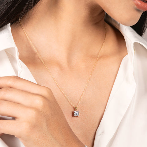 This head-turning pendant showcases an exquisite 2.0 carat Princess cut Cubic Zirconia stone. Princess cut is one of the most popular and sought-after stone shapes, second only to Round cut stones. Our CZ looks just like a real diamond that would cost thousands of dollars. Professionally mounted in a heavy basket setting, this alluring pendant is crafted in solid 14K Yellow Gold, with no other metals mixed. Your necklace will arrive elegantly presented in a deluxe black velvet box. It is a perfect gift for a loved one or for yourself!