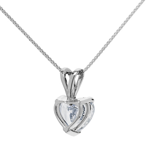 This sweet pendant showcases a brilliant Heart cut 2.0 carat Cubic Zirconia (CZ) stone that looks just like a real diamond without the hefty price tag. Professionally mounted in a heavy basket setting, this charming pendant dangles from a 16-inch box link chain with a springring clasp. The pendant and chain are crafted in solid 14K White Gold, with no other metals mixed (not plated or filled). Your necklace will arrive elegantly presented in a deluxe black velvet box. It is a perfect gift for a loved one or for yourself!
