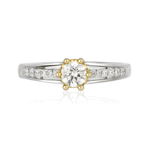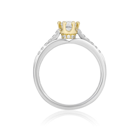 The Enchanted Disney Fine Jewelry 14K White Gold and Yellow Gold 1/2 CTTW Majestic Princess Crown Engagement Ring is a classic and timeless engagement ring with a hint of bewitching charm. The slender band with a row of diamonds on its shoulders is crowned on its top center by a golden six-prong setting holding a mesmerizing round diamond. Looking refined and chic, with a striking dash of femininity, this engagement ring is as regal as the lady who holds your heart.