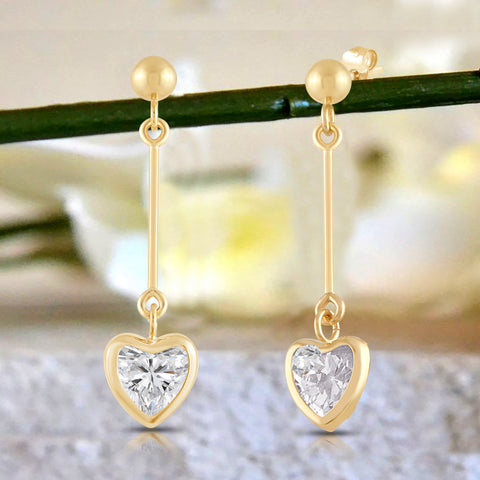 Presenting an exquisite earring crafted from 14K solid yellow gold, featuring a 3mm rhodium-plated ball and a dazzling 6mm heart cut cubic zirconia (CZ) stone, equivalent to 1.0 carats. Our top-grade AAAAA CZ stones possess the brilliance of real diamonds, typically worth thousands of dollars. Expertly mounted in a sturdy bezel setting, these stunning earrings gracefully dangle from your ears, secured with a 14k Gold Push Butterfly Friction Post. Crafted solely from solid 14K yellow gold, with no mixed metals, plating, or filling, this earring radiates pure elegance. To add a touch of luxury, your earrings will arrive elegantly presented in a deluxe black velvet box. Whether you're looking to surprise a loved one or treat yourself, these earrings are a perfect choice that radiates sophistication and timeless charm.