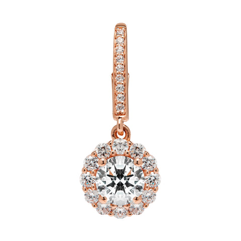 An alluring pair of earrings boasting two Round cut 5.5 mm Cubic Zirconia (CZ) center stones (.63 CT each, 1.26 CTW) , surrounded by 24 more 1.8 mm (.60 CTW) Cubic Zirconia that form a "halo". All dangle from 18 more 1.0 mm stones for a dazzling total diamond equivalent of 2.0 carats for the pair. Top Quality Grade AAAAA CZs look just like real diamonds. They are professionally set in a heavy basket setting with secure lever-back fastenings. All are crafted in solid 14K Rose Gold, with no other metals mixed. This beautiful pair of earrings is elegantly presented in a deluxe black velvet box.