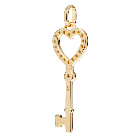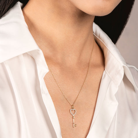- KEY TO HER HEART PENDANT - This symbolic key pendant features a head-turning cubic zirconia Pavé design with a polished finish that creates maximum sparkle and shine. Rest assured that this pendant is professionally crafted in 14K Yellow Gold. Gold fineness is 585 per 14K gold standards. We never gold plate or use gold filled metals in any of our jewelry. Our commitment to consistent gold quality ensures those with metal allergies that our solid gold jewelry is hypoallergenic.