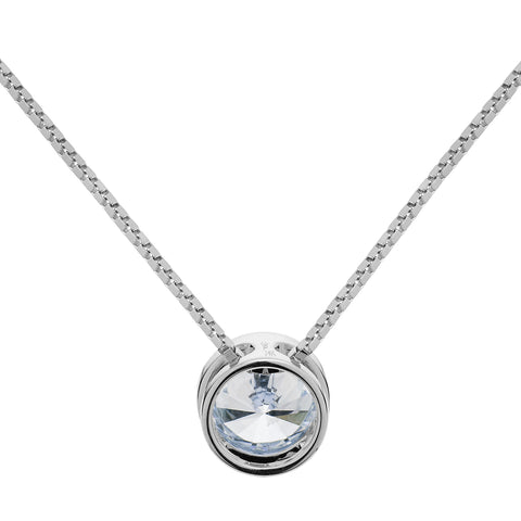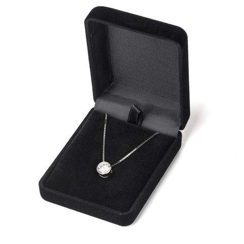 This ethereal pendant shows off a brilliant Round cut Cubic Zirconia stone that looks just like a real diamond without the hefty price tag. Professionally mounted in a thick bezel setting, this beautiful pendant dangles from an 18-inch box link chain with a springring clasp. The pendant and chain are crafted in solid 14K White Gold with no other metals mixed. Your necklace will arrive elegantly presented in a deluxe black velvet box. It is a perfect gift for a loved one or for yourself!