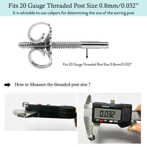 SINGLE .032" WHITE GOLD – This threaded push-on/screw-off replacement earring back specifically replaces your 20 gauge or .032" post stud earring back. Our earring back is intended to fit an adult-sized earring with a screw-back post only. Pad size is 3.7 mm. Screwback earring posts vary by manufacturer and come in many diameters and threading patterns, so we cannot guarantee that this earring back will fit your earring. Please review our sizing chart.