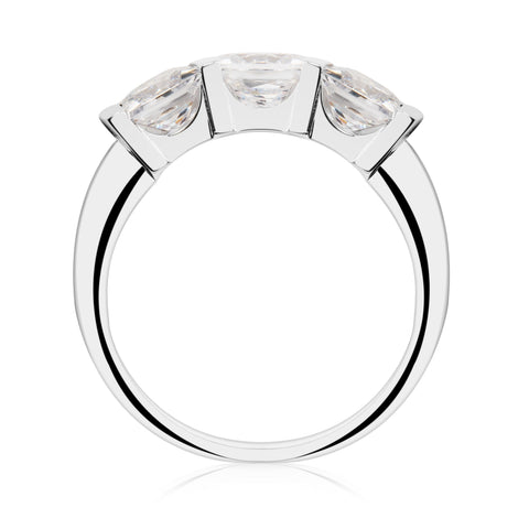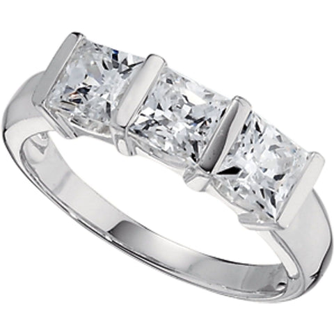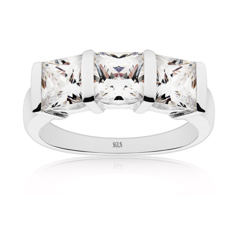 - ABOUT THIS RING - Crafted in solid 925 Sterling Silver, this enchanting ring showcases a gorgeous three-stone setting with a polished finish and set with dazzling Princess cut Cubic Zirconia stones. Approximate dimensions: length of 4.97 mm, width 17.45 mm. Size 6.
