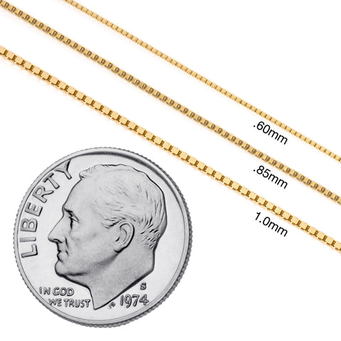 - STURDY BOX LINK CHAIN - The box link chain is known for its link strength and beautiful sheen encircling the neck, ending in a spring ring clasp. With more gold per inch than any other chain link style, it appears delicate, but is amazingly sturdy enough for daily wear. This chain is .85 mm thick.