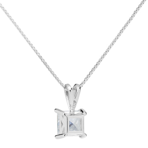 • CUBIC ZIRCONIA - The Princess pendant features a gorgeous Princess cut Cubic Zirconia (CZ) measuring 5.5 mm wide and 1.0 Carat Total Weight. Princess cut is known for its square shape that creates modern lines and stunning sparkle. Cubic Zirconia are the ideal conflict-free alternative to diamonds with similar cut, sparkle, and fire, but at a fraction of the cost. A CZ is a synthesized (lab created) crystalline material that is colorless, hard, and flawless.