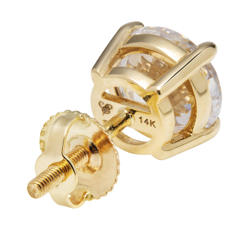 This classic pair of stud earrings showcases exquisite round-cut Cubic Zirconia center stones measuring 8.1 mm for 4.0 CTW (2.0 CT each). Due to its brilliant and traditional design, round cut is the most popular and sought-after stone shapes. Our CZ looks just like a real diamond that would cost thousands of dollars. Professionally mounted in a heavy basket setting, these chic earrings are secured with screw-back fastenings, all crafted in solid 14K Yellow Gold. Your earrings will arrive elegantly presented in a deluxe black velvet box. They will make a perfect gift for a loved one or for yourself!